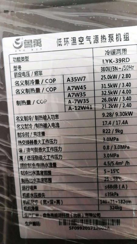 機組型號:空氣源熱泵LYK-39RD(12.5P機組)