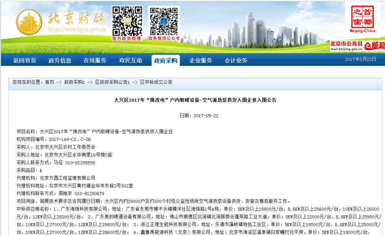 喜報丨鑫魯禹入圍2017年北京市大興區”煤改電”項目