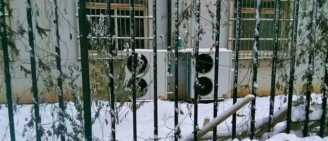 四、定時查看并清掃室外機組底座,避免化霜冷凝水排水不暢結冰或者地面積雪過厚造成空氣源熱泵被凍。