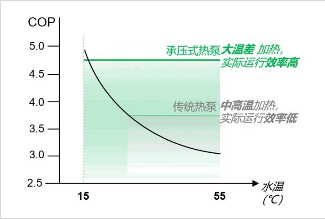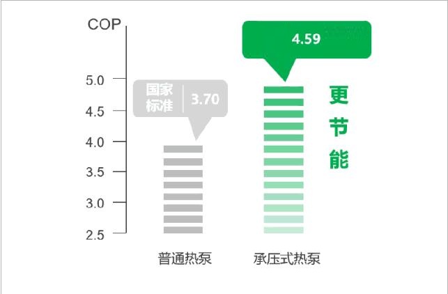 承壓式熱泵熱水機組利用逆卡諾循環原理,通過采用大溫差換熱,充分利用空氣中的大量熱量,提供數倍于所消耗電能的熱量,COP最高達4.59,與傳統熱泵相比,運行費用更低。