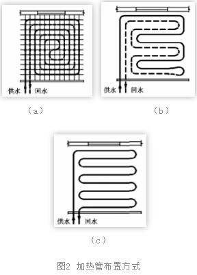 選用末端設(shè)備時應(yīng)考慮房間功能、生活習(xí)慣和運行方式,從舒適性和經(jīng)濟性方面考慮,選擇適合住戶需求的地板輻射供暖、風(fēng)機盤管供暖、散熱器供暖形式。新建與既有建筑增設(shè)供暖設(shè)施要加以區(qū)別:新建住宅可完全按設(shè)計規(guī)范規(guī)定進行,而既有建筑增設(shè)供暖設(shè)施要考慮住戶的具體要求,可進行局部主要房間加裝供暖設(shè)施。既有建筑增設(shè)地板輻射供暖時應(yīng)考慮荷載,盡量采用干式地板供暖,并考慮局部供暖和家具擺放遮擋。地面飾面層應(yīng)采用熱阻小的材料。各環(huán)路長度應(yīng)盡可能一致,并加設(shè)調(diào)節(jié)和環(huán)路關(guān)斷閥門。加熱管布置方式可采用圖2的形式。