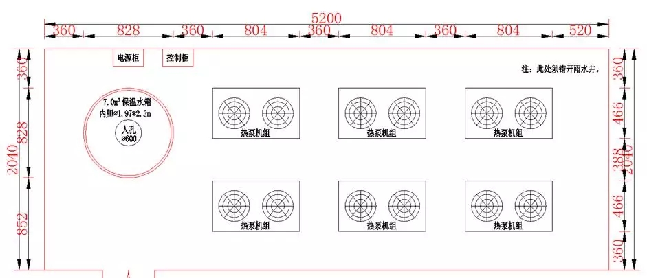 這三個系統集中布置為三塊場地,系統一占地面積17m×80m,共1360m2,共布置15臺機組和2個9.5m3的保溫水箱,機組總制熱量為1432.5kW,分別承擔1、2、4、6、7號樓的供熱負荷。如下圖。