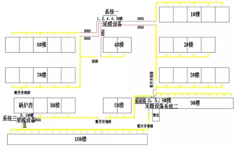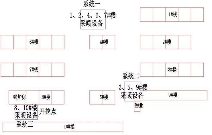 這個案例在陜西,一共有10棟住宅和物業管理,1~8號樓為6層,9~10號樓是1~2層,采暖面積一共42900多平,原先在8號樓東南角有一個燃煤鍋爐房。下圖是鍋爐房原先的管網布置,供暖系統由鍋爐房循環泵經室外管網分別送到各棟樓室內的采暖系統。