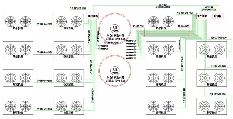 系統三占地面積8m×6.5m,共52m2,共布置4臺機組和1個5.0m3的保溫水箱,機組總制熱量為382kW,分別承擔8、10號樓的供熱負荷。如下圖。